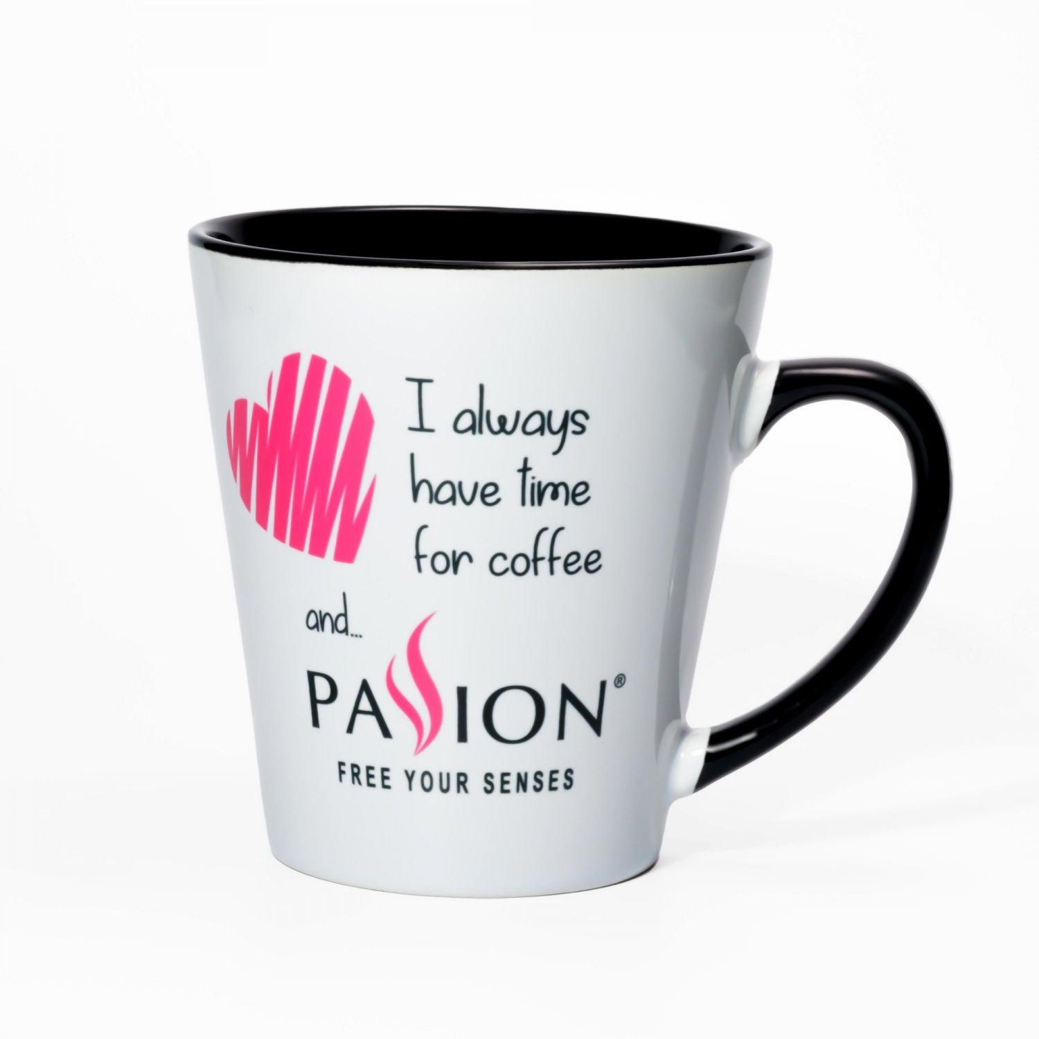 De cor branca, com interior e pega em preto, esta peça elegante destaca-se não só pelo seu contraste visual, mas também pela mensagem inspiradora e provocadora que carrega. Ao lado de um coração vermelho, pode ler-se a frase: "I always have time for coffee and passion. Free your senses." — uma afirmação perfeita para quem vive intensamente e valoriza os prazeres da vida.