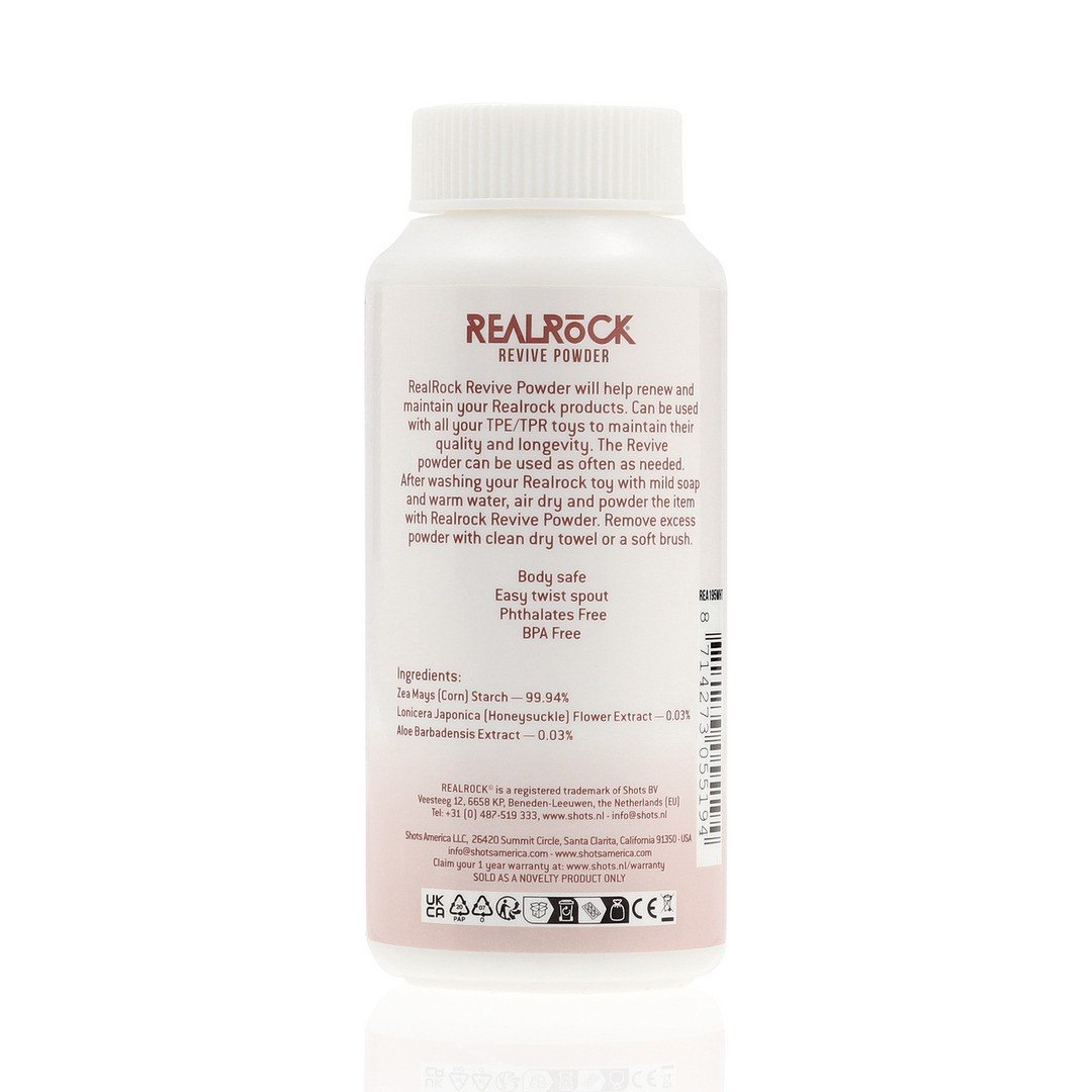 O Pó RealRock Revive foi cuidadosamente desenvolvido para garantir a manutenção, proteção e conservação dos seus brinquedos íntimos fabricados em materiais TPE e TPR. Com uma fórmula especialmente criada para estes materiais, este pó regenerador ajuda a restaurar a textura suave original, mantendo os seus acessórios em excelentes condições durante muito mais tempo.