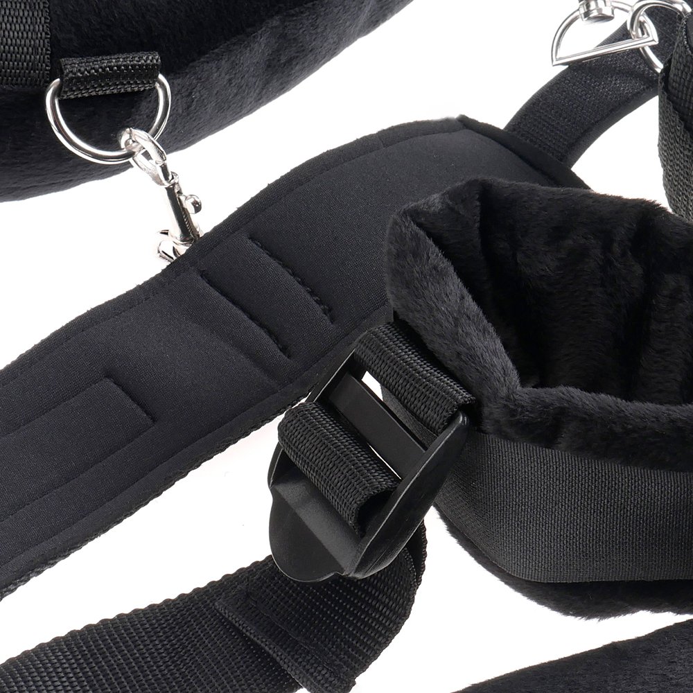 Composto por algemas ajustáveis e almofadadas para pulsos e tornozelos, cordas resistentes e suporte para o pescoço com almofada em pelúcia macia, este kit oferece contenção segura e prazerosa. Tudo isto com a robustez do metal nos engates e o conforto do nylon nos materiais de fixação.